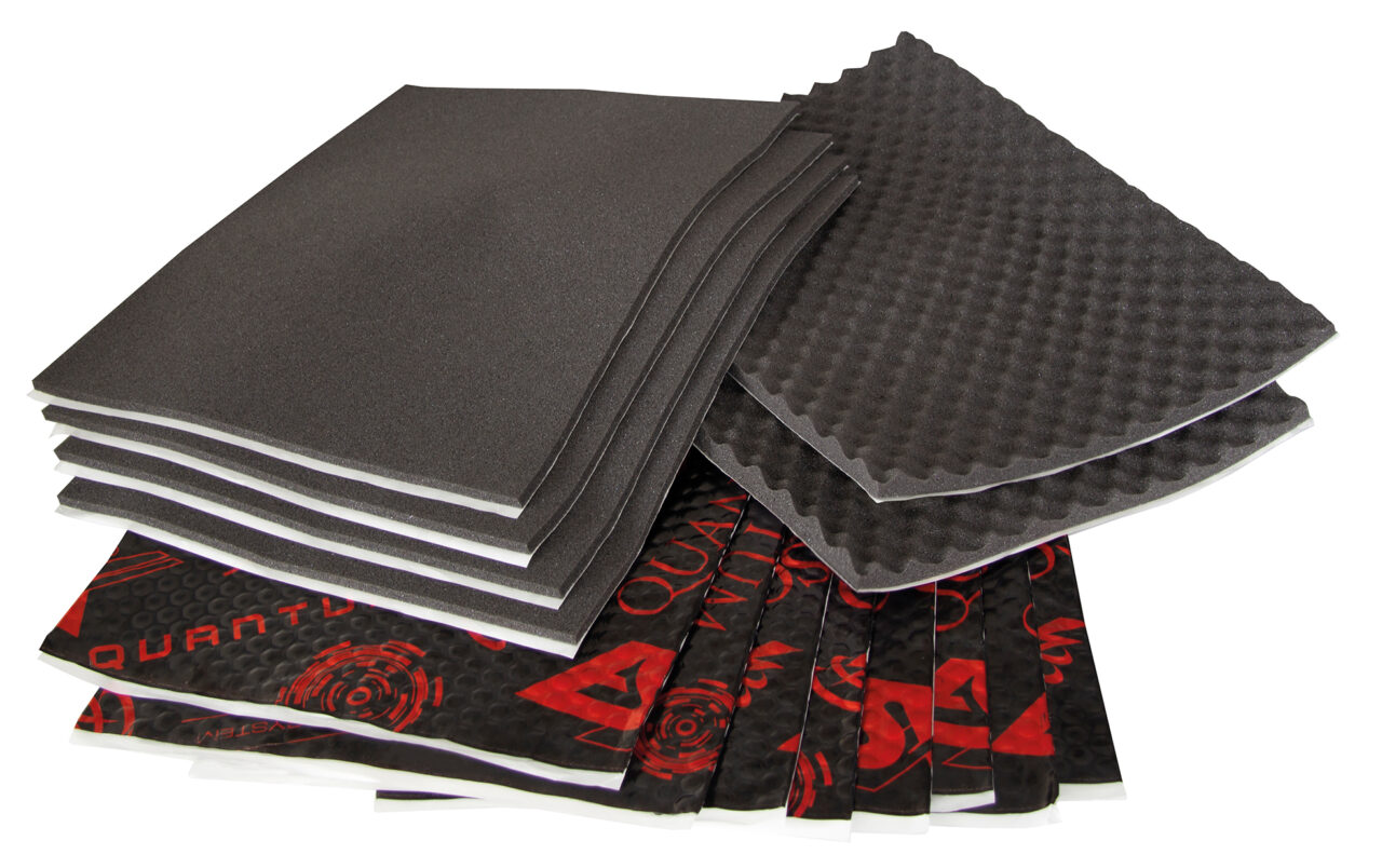 In den Dämm-Sets sind jeweils zwei Platten glatter QSC7 Akustikschaum, vier Platten genoppter QSC15 Akustikschaum und 8 Matten Aluminium-Butyl enthalten. Im preiswerten Quantum QDK1 ist das 1,8 mm starke Aluminium-Butyl QRM18 enthalten, welches für herkömmliche Anlagen und Anwendungen völlig ausreichend ist und bereits sehr gute Dämmeigenschaften besitzt.